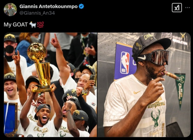 隨后,雄鹿球星揚尼斯-阿德托昆博在社交媒體發(fā)布動(dòng)態(tài),曬出了老隊友米德?tīng)栴D奪冠后的照片(如下圖所示),并配文道:“我的GOAT ????????”