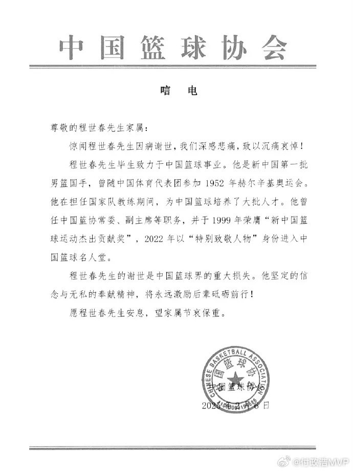 中國籃協(xié)前任副主席、原北京市體委副主任、新中國第一代國手程世春因病逝世,中國籃協(xié)向程世春協(xié)家屬發(fā)唁電慰問(wèn)。