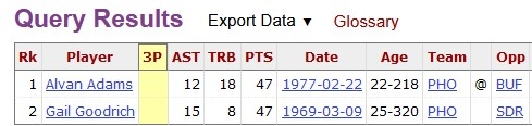 據統計,太陽(yáng)隊史僅有3名球員打出過(guò)至少47分6板11助的數據,前兩人分別是阿爾萬(wàn)-亞當斯和蓋爾-古德里奇。