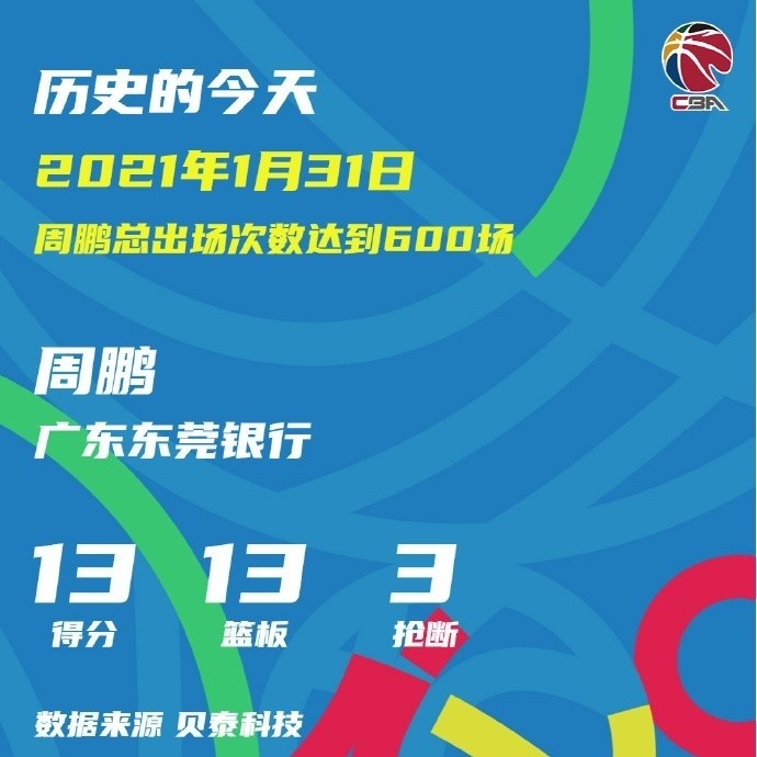 2021年1月31日,CBA聯(lián)賽常規賽第37輪,廣東東莞大益以120-98戰勝蘇州肯帝亞。這場(chǎng)比賽,周鵬首發(fā)出戰,全場(chǎng)7投4中,得到13分13籃板3搶斷。此役之后,他的總出場(chǎng)次數達到600場(chǎng)里程碑,他也是CBA聯(lián)賽歷史上第六位達到該成就的球員。彼時(shí),他的年齡為31歲113天。