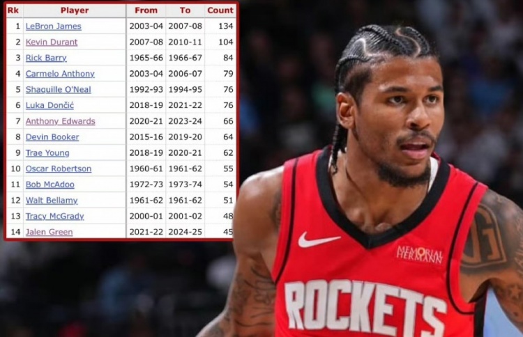 在這一榜單排名第一的是詹姆斯,一共134場(chǎng),第二是杜蘭特104場(chǎng),第三是名宿里克-巴里,84場(chǎng)。第四至第六是安東尼(79)、奧尼爾(76)、東契奇(76),第七至第十是愛(ài)德華茲(66)、布克(64)、特雷-楊(62)和名宿大O奧斯卡-羅伯特森(55)。