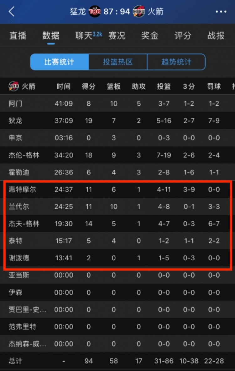 本場(chǎng)比賽,火箭替補球員進(jìn)攻端為球隊作出巨大貢獻,5人輪換上場(chǎng)皆有得分,其中3人上雙,合砍全隊94分中的43分。