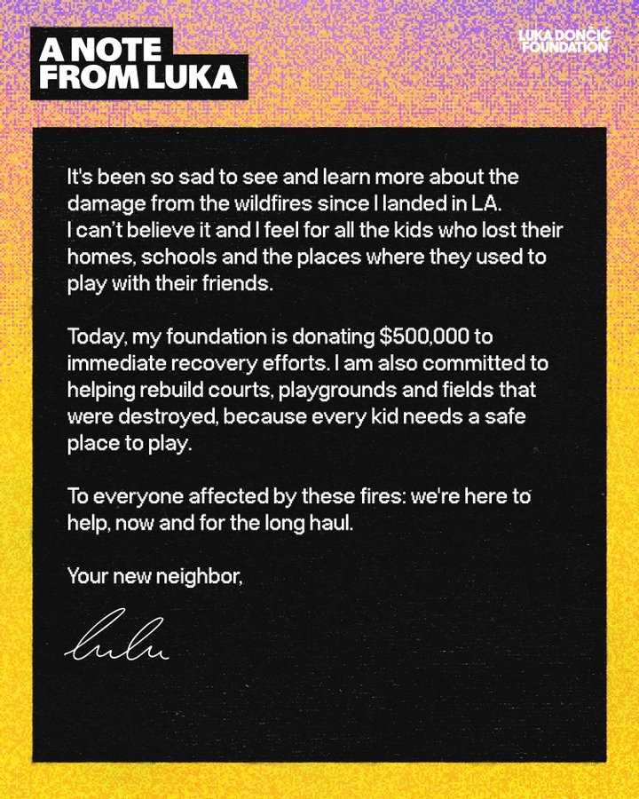 02月11日訊 東契奇宣布,他的基金會(huì )將捐款50萬(wàn)美元,用于幫助山火后的緊急重建工作,公告如下:
