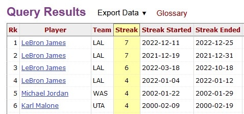 詹姆斯(4次,最多連續7場(chǎng)),喬丹、馬龍。