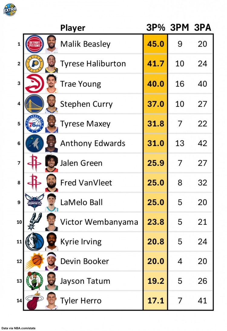 據統計,本賽季共有14名球員在關(guān)鍵時(shí)刻(常規時(shí)間最后5分鐘或加時(shí)賽且分差不超過(guò)5分)出手了至少20記三分,這14人按命中率排名比斯利最準,庫里排第四,具體如下圖:
