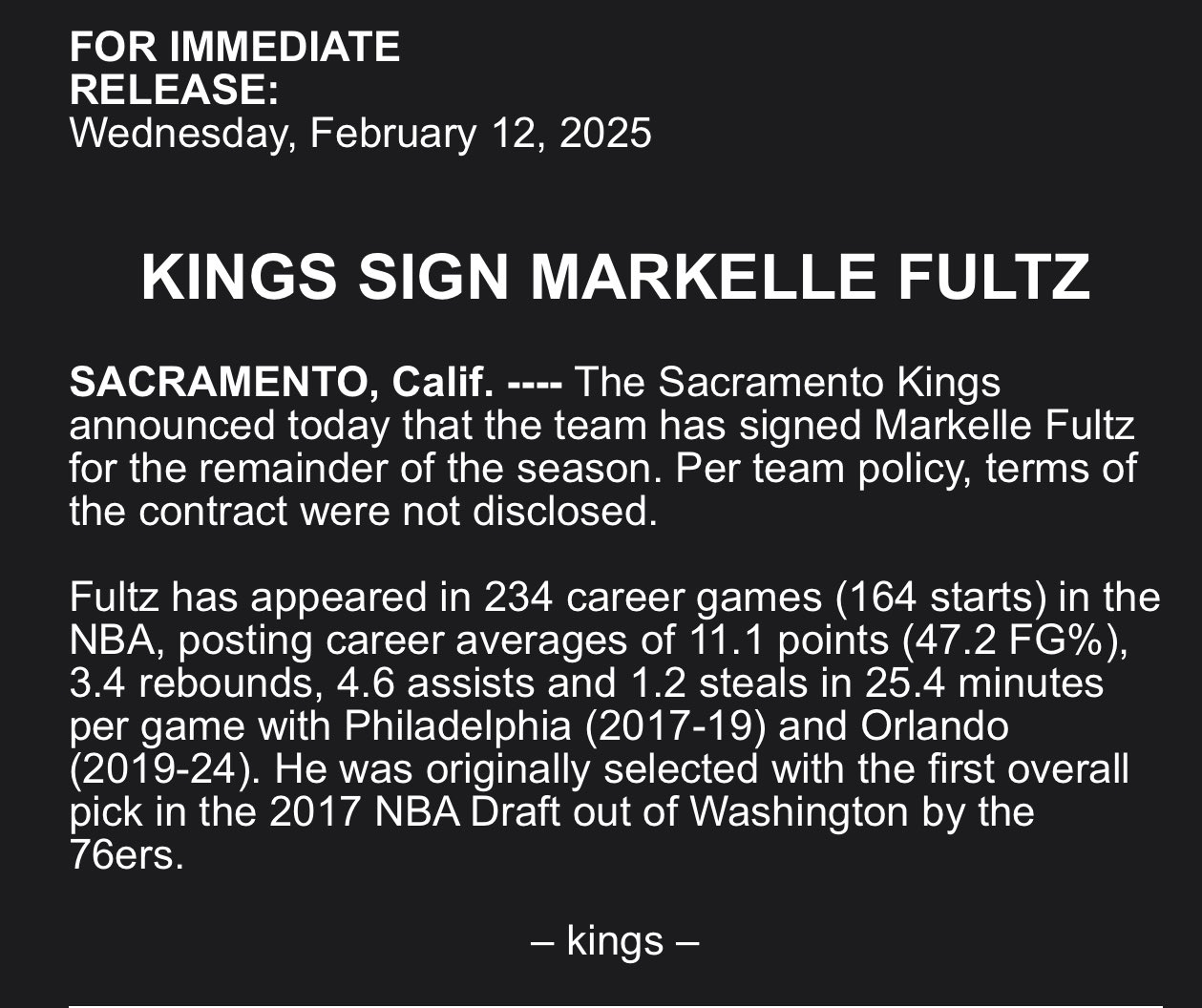 稍晚國王官宣了這一消息,并宣布和富爾茨簽約至賽季結束。根據球隊政策,合同細節未予公布。