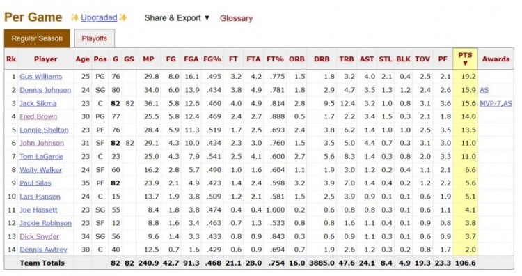 1975-76賽季,超音速成為了全聯(lián)盟最年輕的球隊。他們的核心是23歲的湯姆-伯利森、24歲的“光頭”沃茨、24歲的萊昂納德-格雷與27歲的弗雷德-布朗。他們斗志昂揚,球風(fēng)強硬,出人意料地取得了43勝39負的常規賽戰績(jì),再次重返季后賽。
