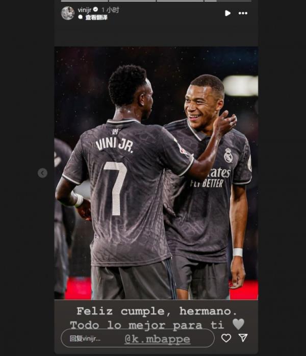 維尼修斯曬出兩人合照,并配文:“生日快樂(lè ),兄弟。祝你一切順利@姆巴佩”。