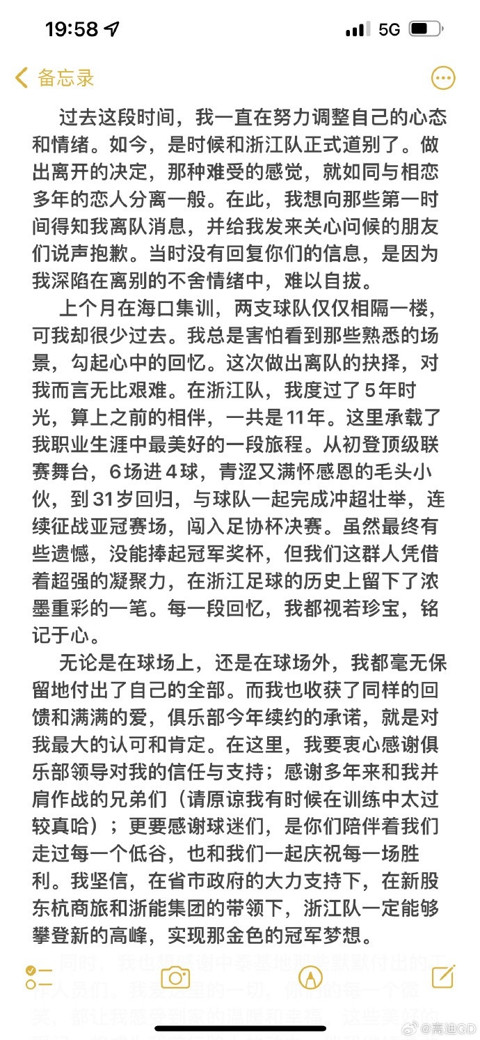 過(guò)去這段時(shí)間,我一直在努力調整自己的心態(tài)和情緒。如今,是時(shí)候和浙江隊正式道別了。做出離開(kāi)的決定,那種難受的感覺(jué),就如同與相戀多年的戀人分離一般。在此,我想向那些第一時(shí)間得知我離隊消息,并給我發(fā)來(lái)關(guān)心問(wèn)候的朋友們說(shuō)聲抱歉。當時(shí)沒(méi)有回復你們的信息,是因為我深陷在離別的不舍情緒中,難以自拔。