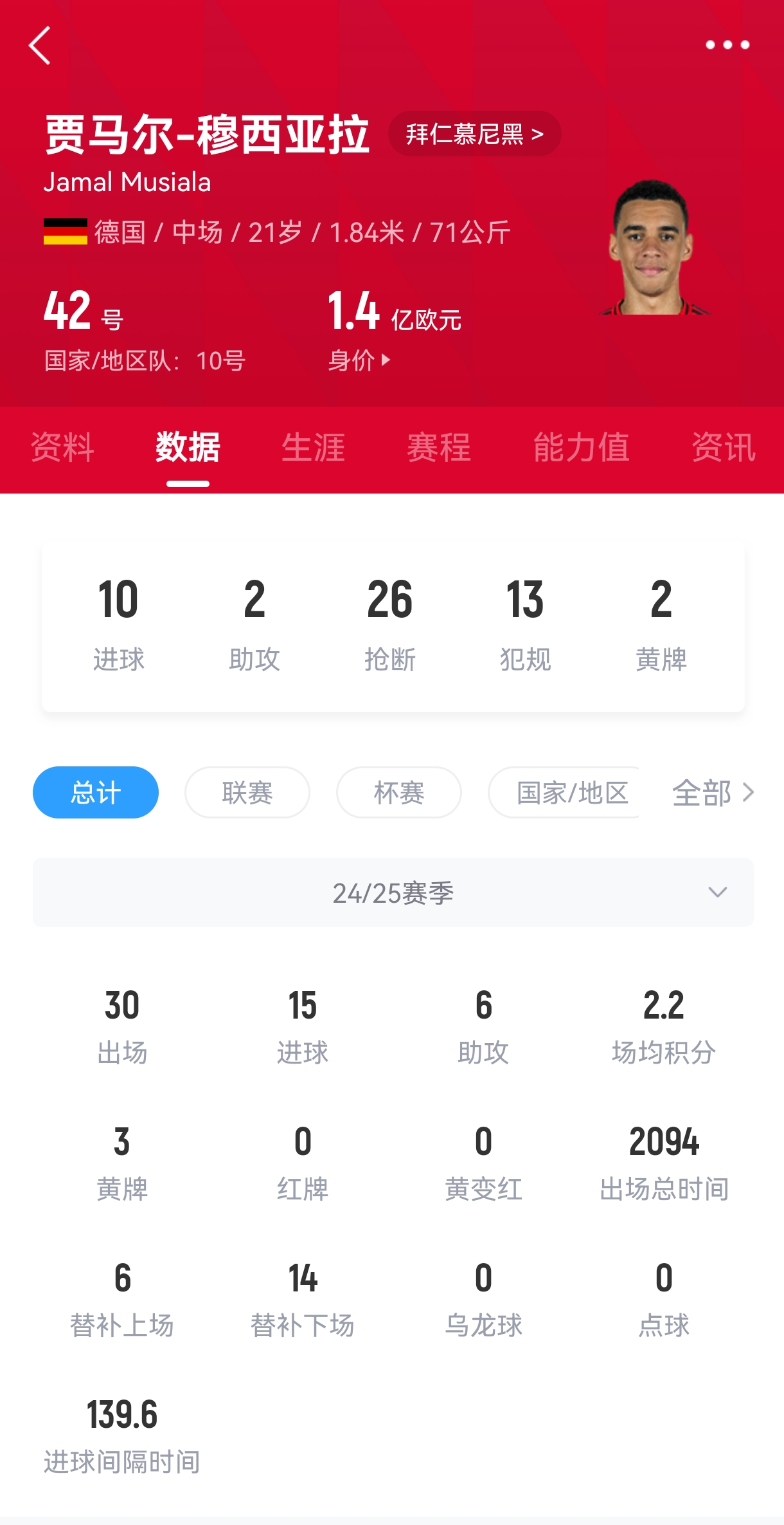 穆西亞拉現年21歲,德國籍攻擊型中場(chǎng)。他青少年時(shí)期曾在切爾西梯隊接受訓練,2019年他轉投拜仁青訓。2020年夏天穆西亞拉正式進(jìn)入拜仁一線(xiàn)隊,至今已經(jīng)代表球隊出戰193場(chǎng),貢獻58球38助。在國家隊層面,穆西亞拉已經(jīng)代表德國成年隊出戰38場(chǎng)打進(jìn)7球。穆西亞拉現如今的德轉身價(jià)已達到1.4億歐元。