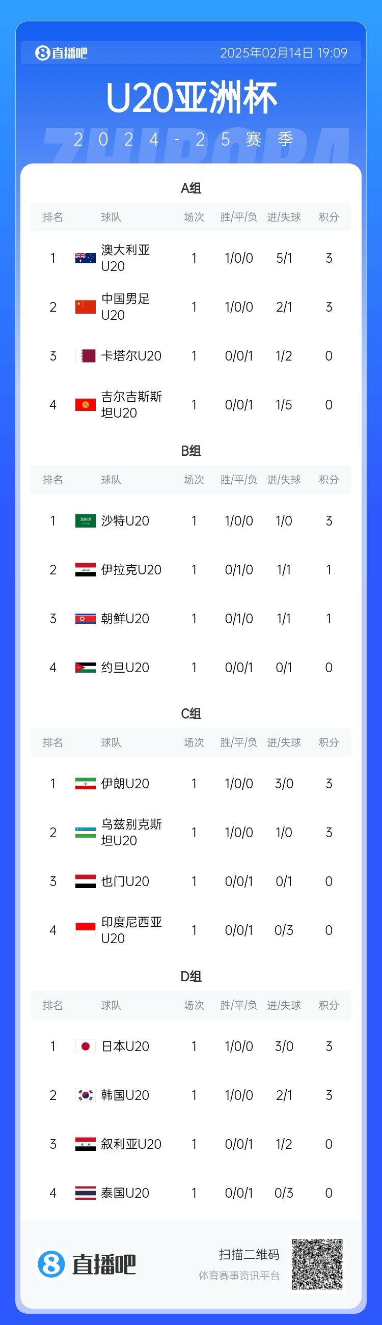 ??2025年02月12日 U20亞洲杯-澳大利亞5-1吉爾吉斯斯坦迎開(kāi)門(mén)紅 后者15日將戰國青