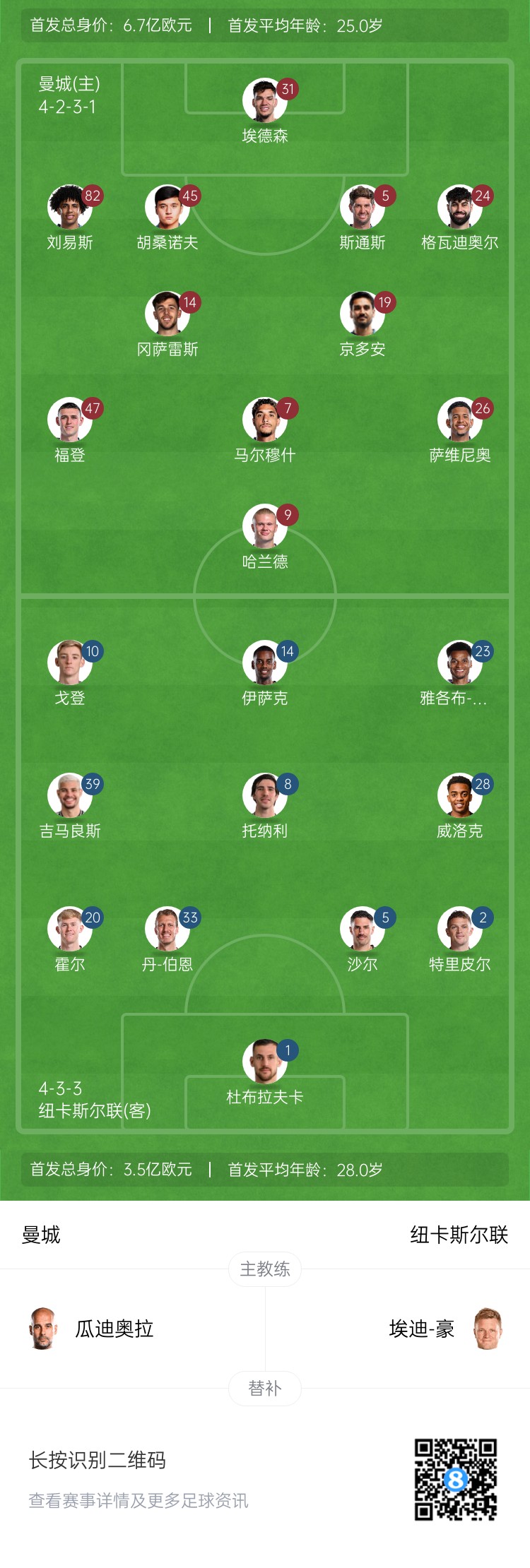 曼城12勝5平7負積41分,排名英超第5;紐卡12勝5平7負,排名英超第6。本場(chǎng)迪亞斯和阿克雖然抵達球場(chǎng),但他們缺席了大名單。