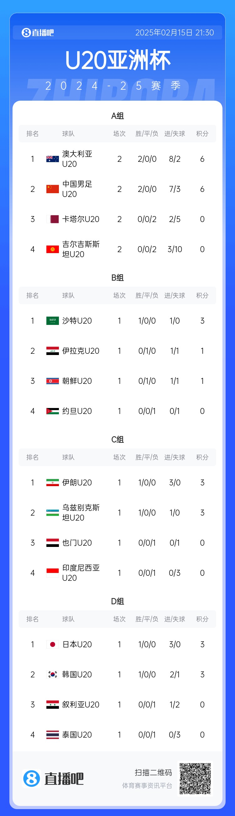 02月15日訊 U20亞洲杯A組兩輪戰罷,中國U20兩戰全勝,2-1卡塔爾、5-2吉爾吉斯斯坦,積6分已經(jīng)提前一輪出線(xiàn)。