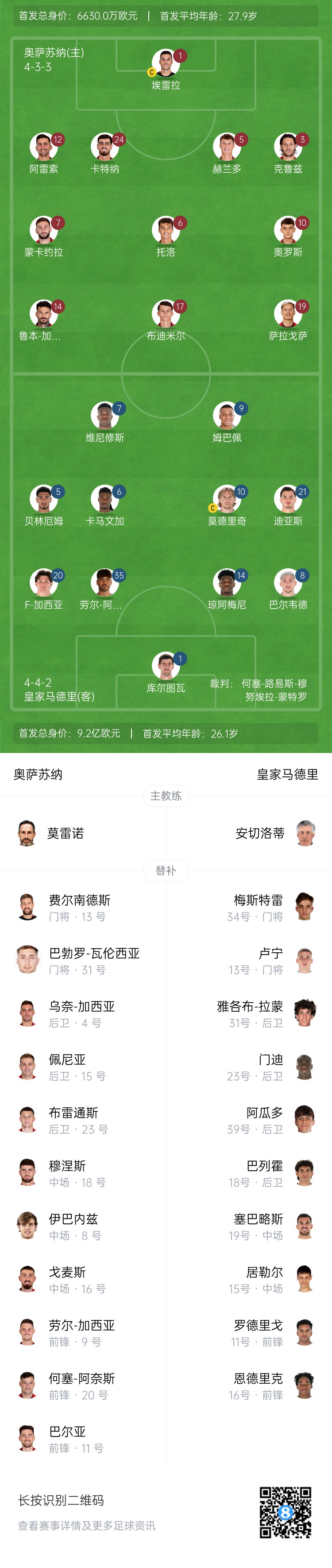 2月15日訊 北京時(shí)間23點(diǎn)15分,西甲第24輪,奧薩蘇納vs皇馬,賽前首發(fā)公布。