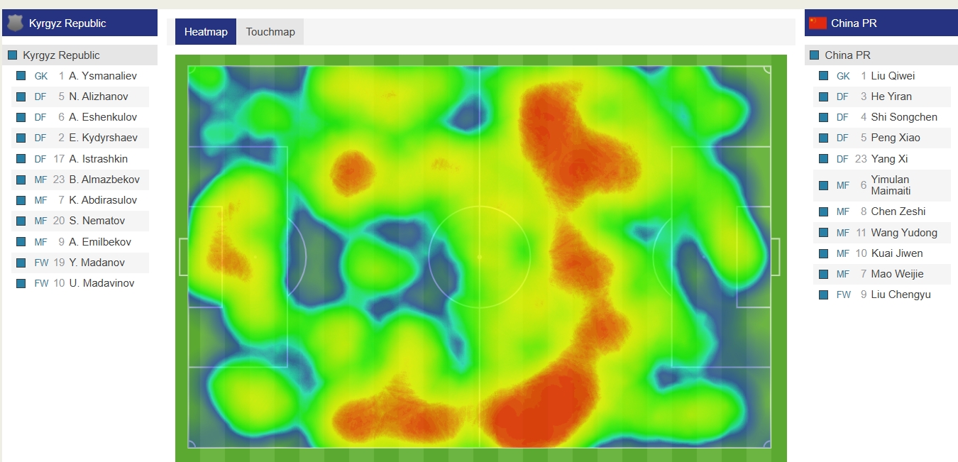 國青(深藍)半場(chǎng)12次攻入對手禁區,吉爾吉斯斯坦在國青禁區內僅3次觸球