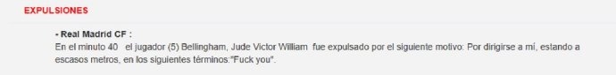 在賽后裁判報告中,談及貝林厄姆被紅牌罰下的原因:他在距離我僅數米遠的地方,對我說(shuō)了“Fxxk you”。