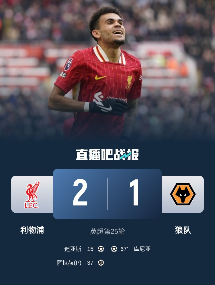 英超第25輪,利物浦2-1戰勝狼隊,迪亞斯破門(mén)、薩拉赫點(diǎn)射。