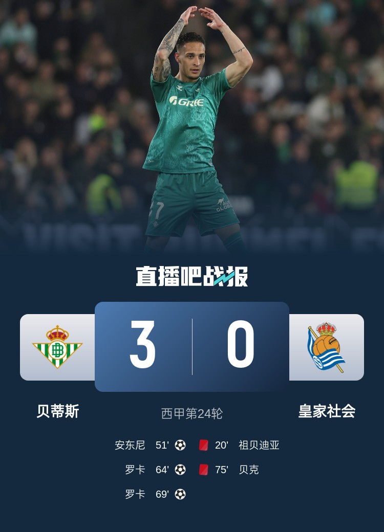 西甲第24輪,貝蒂斯3-0皇家社會(huì ),安東尼世界波,羅卡梅開(kāi)二度。