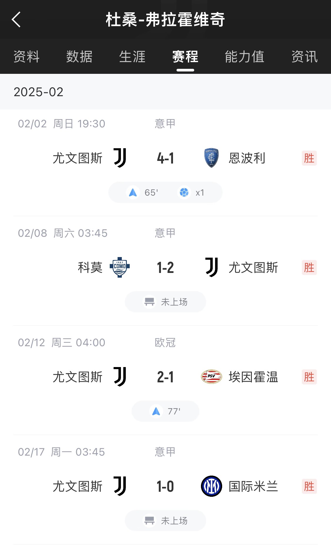 2月份至今尤文的4場(chǎng)比賽,弗拉霍維奇2場(chǎng)未登場(chǎng),2場(chǎng)替補,打入1球。