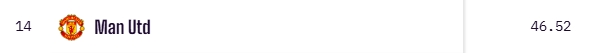 數據機構Opta最新的預測結果顯示,曼聯(lián)本賽季最終可能拿到46-47個(gè)積分,預計排名聯(lián)賽第14。