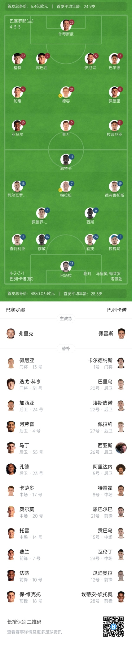 巴薩首發(fā):25-什琴斯尼、2-庫巴西、5-伊尼戈-馬丁內斯、3-巴爾德、32-??送?福特、6-加維、21-德容、8-佩德里、11-拉菲尼亞、19-亞馬爾、9-萊萬(wàn)多夫斯基