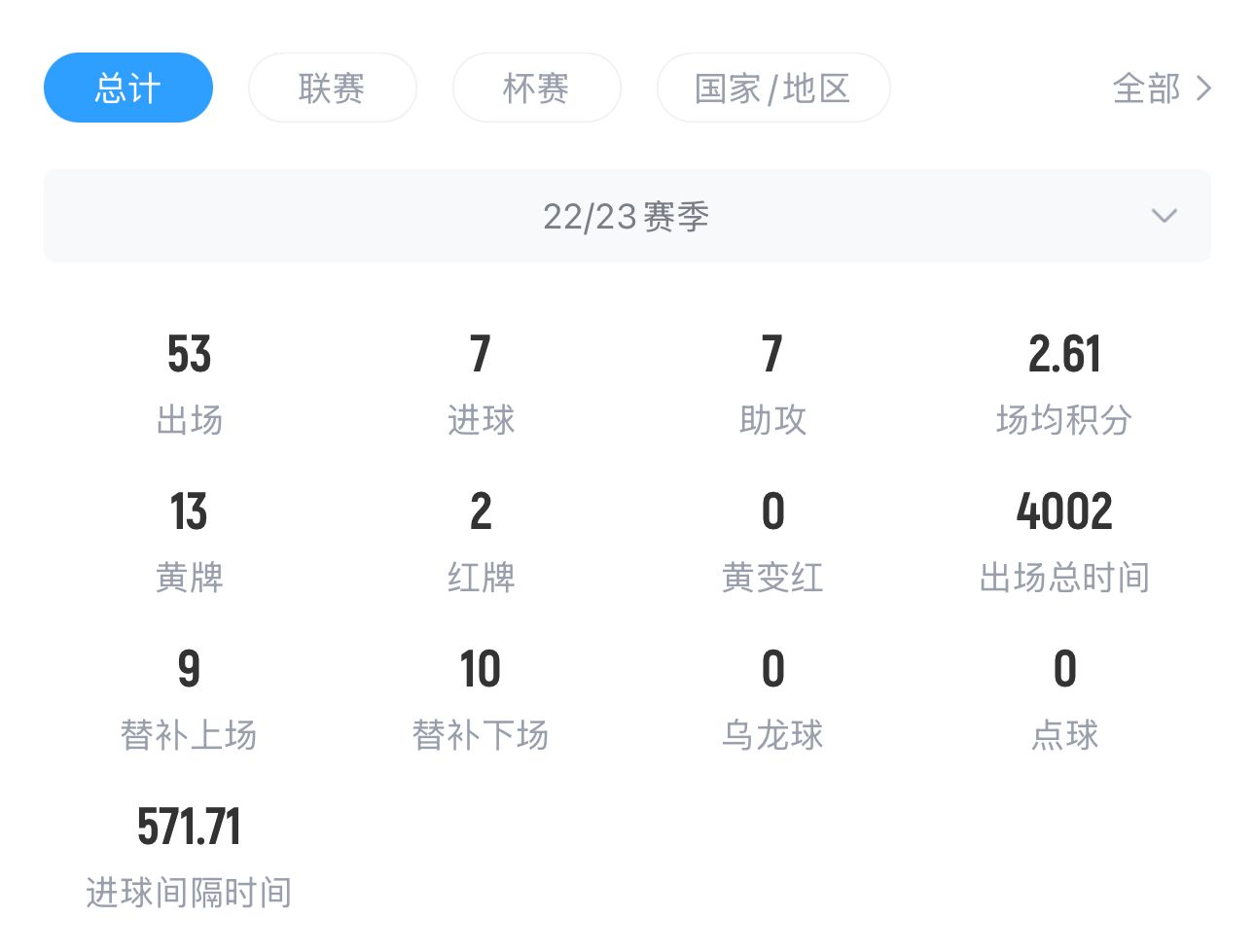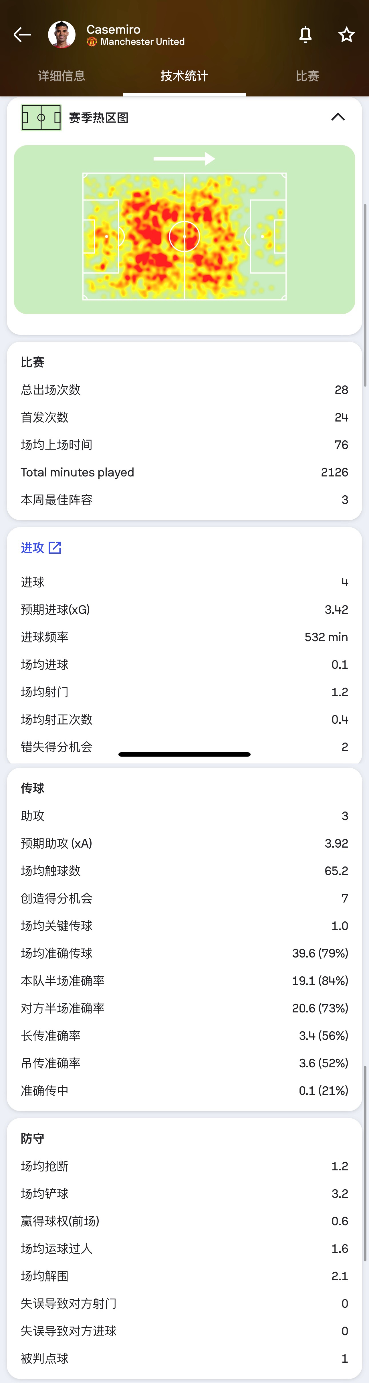 卡塞米羅于2022年夏天從皇馬加盟曼聯(lián),22/23賽季為皇馬出場(chǎng)2次貢獻1次助攻,為曼聯(lián)出場(chǎng)51次,貢獻7球6助攻。