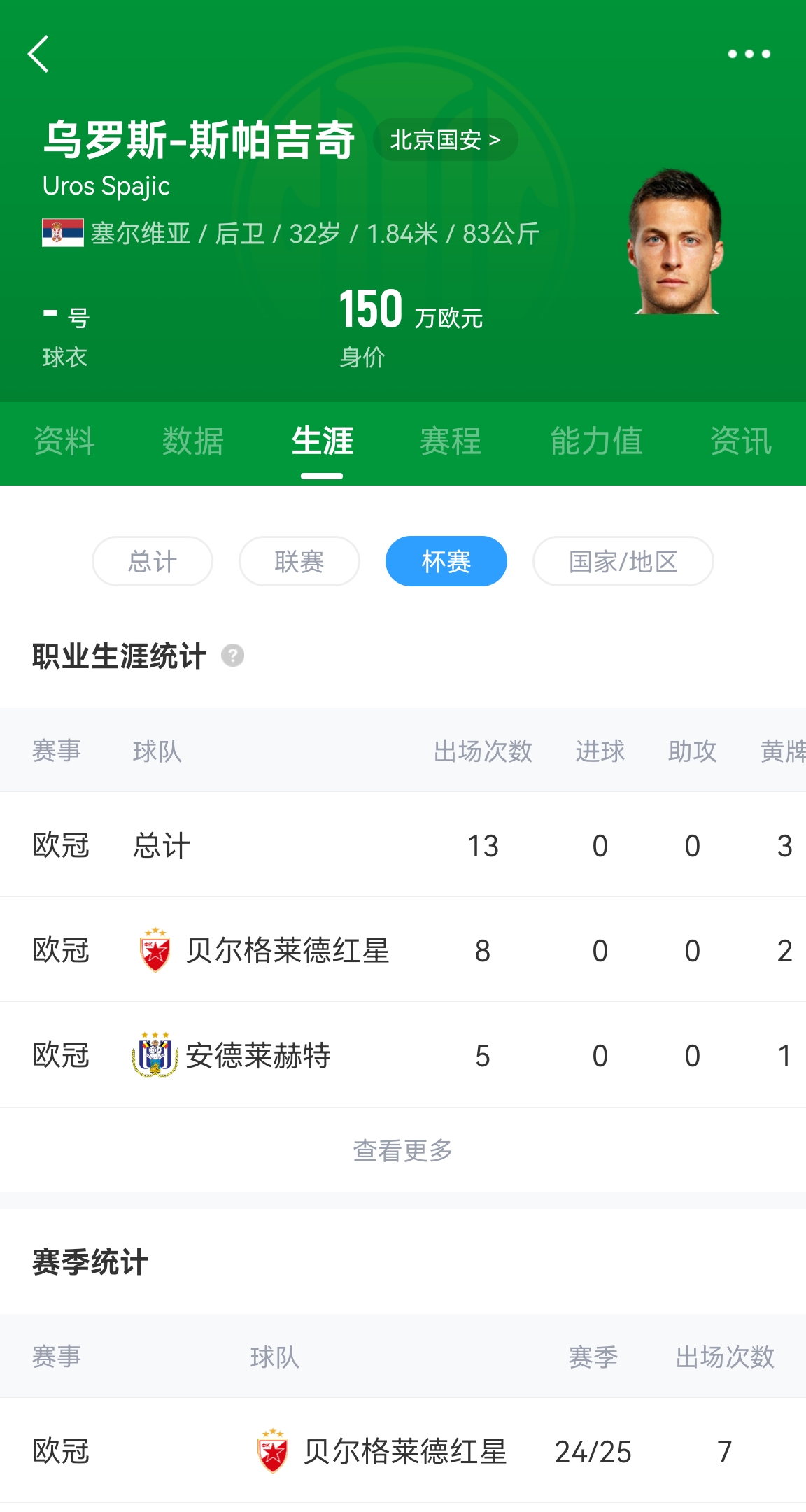 斯帕吉奇是紅星的絕對主力,本賽季出場(chǎng)19次,歐冠對陣國米、巴薩、米蘭等隊的比賽全部首發(fā)打滿(mǎn)全場(chǎng)!