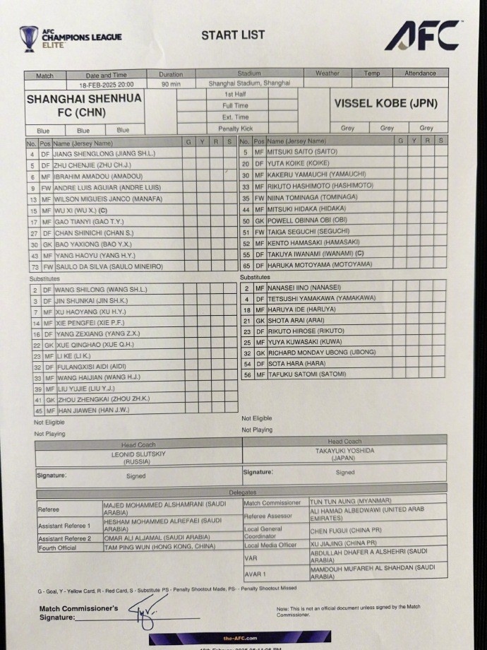 2024/25亞冠精英聯(lián)賽第8輪 上海申花vs神戶(hù)勝利船 首發(fā)名單 ???