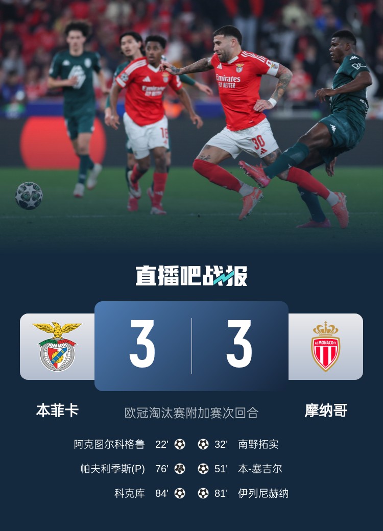 本菲卡3-3總比分4-3淘汰摩納哥晉級16強。