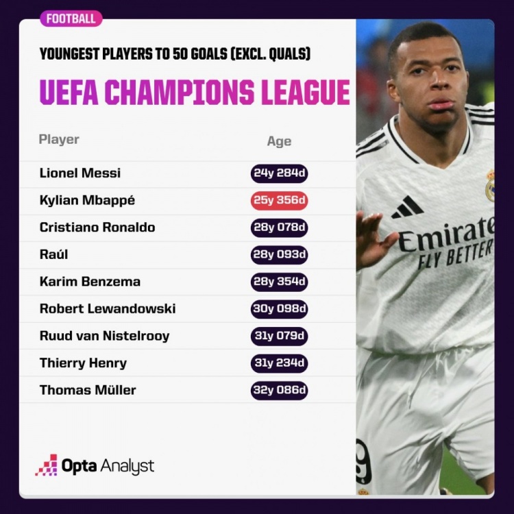 首回合對皇馬哈蘭德打進(jìn)兩球,將個(gè)人歐冠進(jìn)球數提升至49球,如果次回合哈蘭德再度攻破皇馬球門(mén),那他將以24歲213天的年齡,成為最快達成歐冠50球的球員。