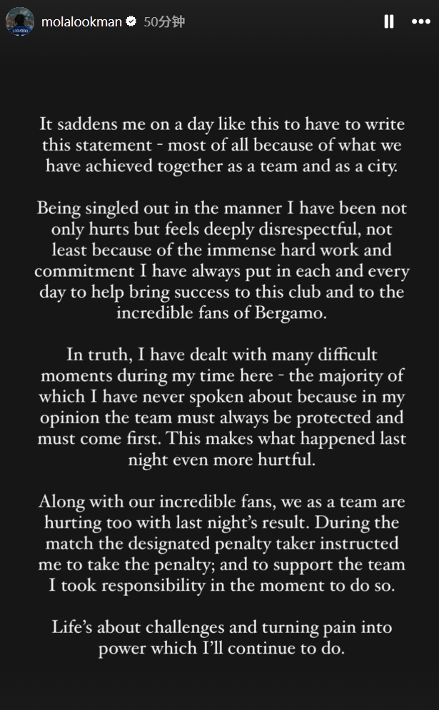 盧克曼表示:“在這樣的日子里,我不得不寫(xiě)下這段聲明,這讓我感到悲傷——最主要的是因為我們作為一個(gè)團隊和一個(gè)城市所取得的成就。我被以這種方式單獨攻訐,不僅讓人受傷,而且深感不尊重,尤其是考慮到我每天都全力以赴、充滿(mǎn)承諾地工作,幫助俱樂(lè )部取得成功,努力回報貝爾加莫那些令人難以置信的球迷。