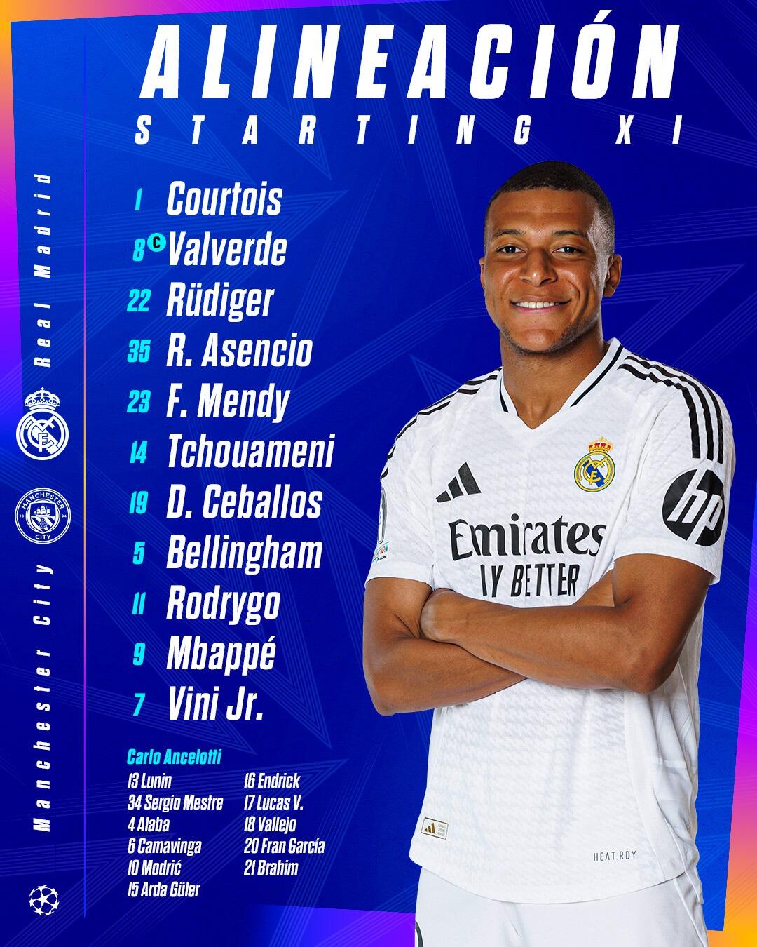 皇馬替補:13-盧寧、34-梅斯特雷、4-阿拉巴、6-卡馬文加、10-莫德里奇、15-居勒爾、16-恩德里克、17-巴斯克斯、18-巴列霍、20-弗蘭-加西亞、21-迪亞斯