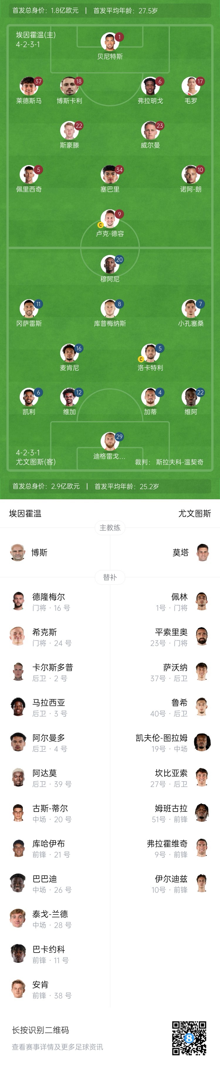 埃因霍溫替補:16-德隆梅爾、24-??怂?、2-卡爾斯多普、3-馬拉西亞、4-阿爾曼多、39-阿爾莫、20-古斯-蒂爾、21-庫哈伊布、26-巴巴迪、28-泰戈-蘭德、11-約翰-巴卡約科、38-安肯