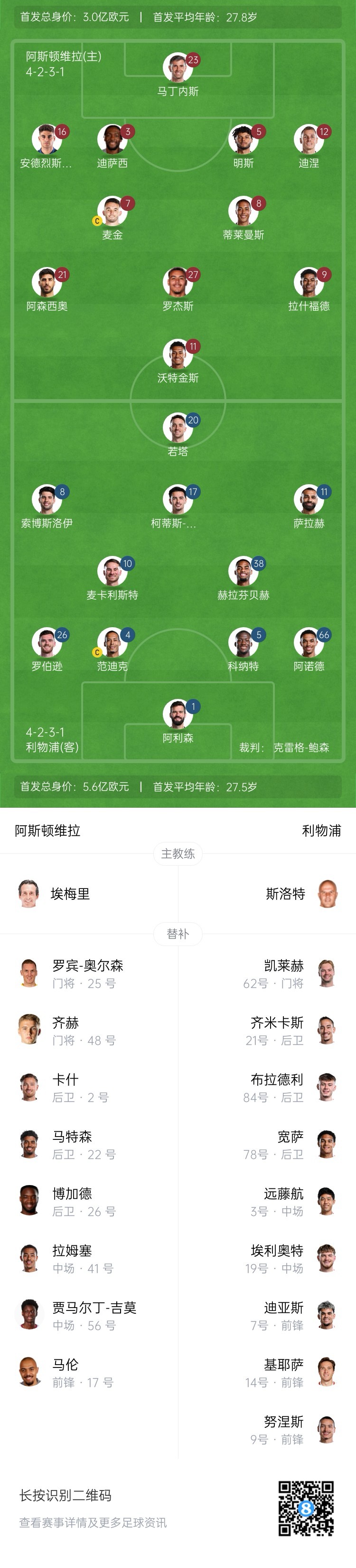 維拉首發(fā):23-馬丁內斯、16-加西亞、3-迪薩西、5-明斯、12-迪涅、21-阿森西奧、8-蒂萊曼斯、7-麥金、9-拉什福德、27-羅杰斯、11-沃特金斯