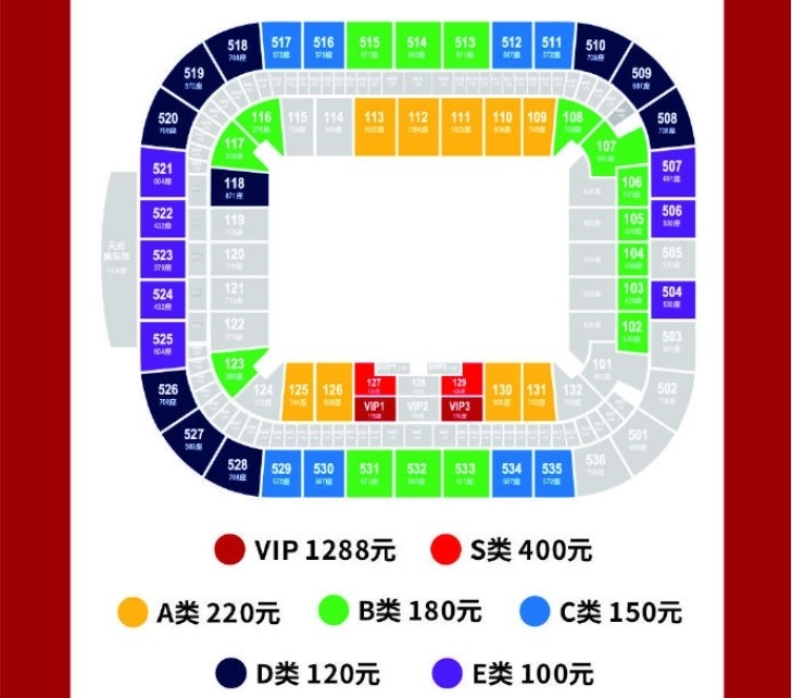 本場(chǎng)比賽票價(jià)分為7檔,從低到高分別為100元、120元、150元、180元、220元、400元、1288元。