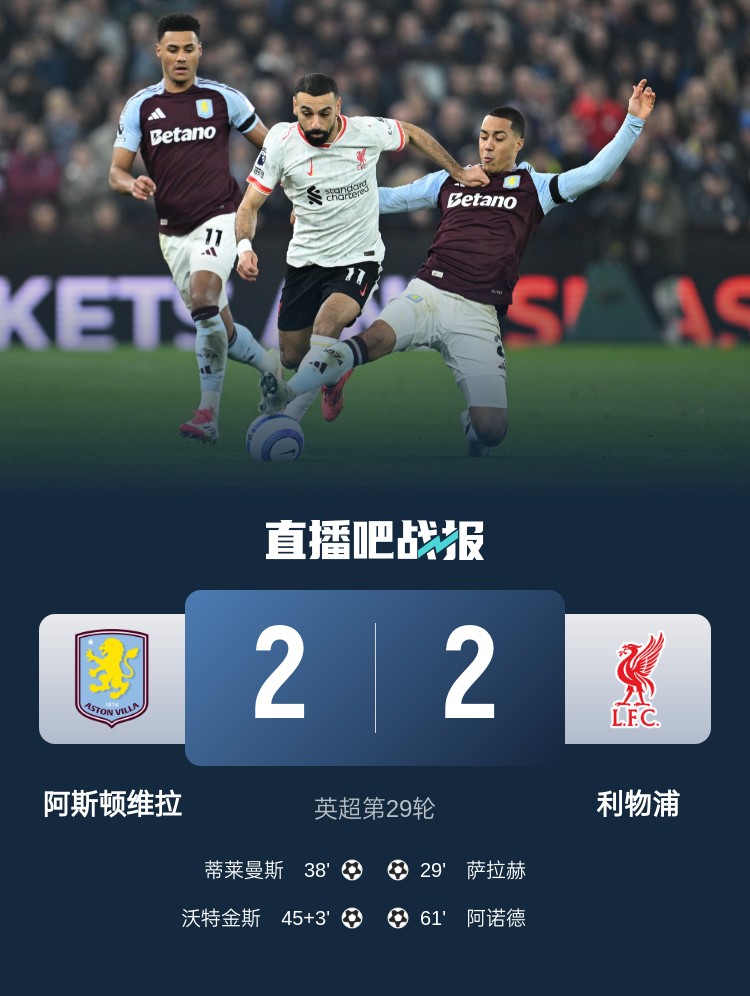 英超第29輪,利物浦2-2戰平維拉。上半場(chǎng),加西亞回傳送禮,若塔搶斷后助攻薩拉赫破門(mén),蒂萊曼斯扳平,沃特金斯頭球助維拉反超;下半場(chǎng),薩拉赫助攻阿諾德進(jìn)球,利物浦扳平比分,努涅斯屢次錯失良機。