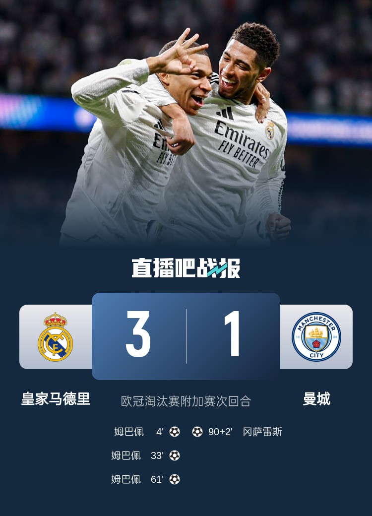 姆巴佩戴帽!皇馬3-1曼城總比分6-3晉級16強 下輪戰馬競或藥廠(chǎng)