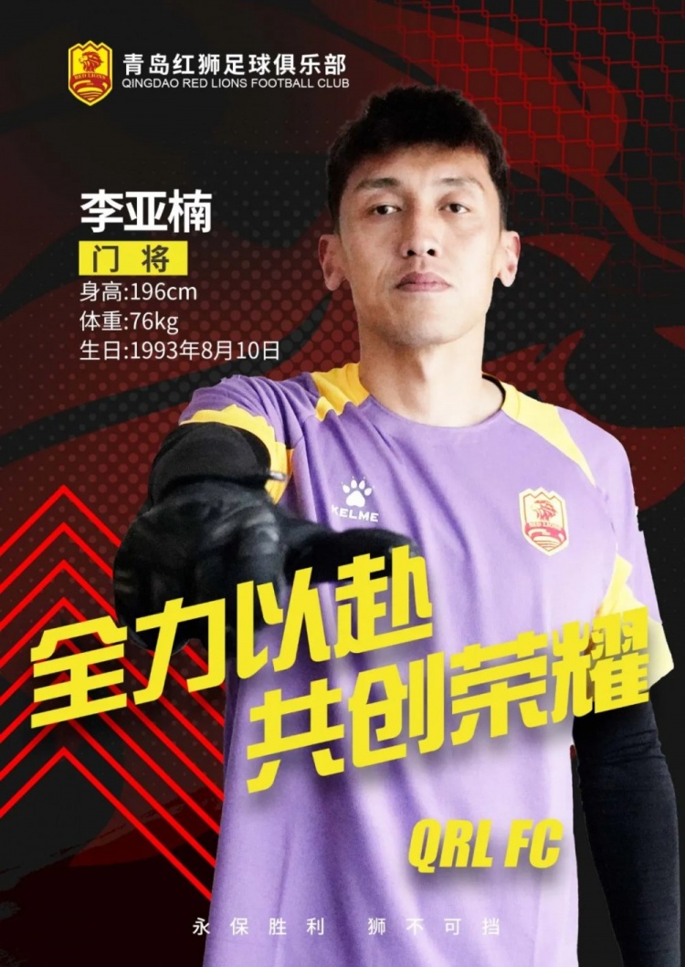 李亞楠,出生于1993年8月10日,身高196cm,體重76kg,腳下技術(shù)出色,高空球控制面積大,擅長(cháng)一對一正面封堵。作為門(mén)將,他沉著(zhù)穩定,2021-2023年加盟蘇州東吳足球俱樂(lè )部期間,中甲出場(chǎng)25場(chǎng),曾摘得官方頒發(fā)的南京賽區聯(lián)賽第18輪最佳球員榮譽(yù)。相信他會(huì )以更好的狀態(tài)投入到青島紅獅的新征程!