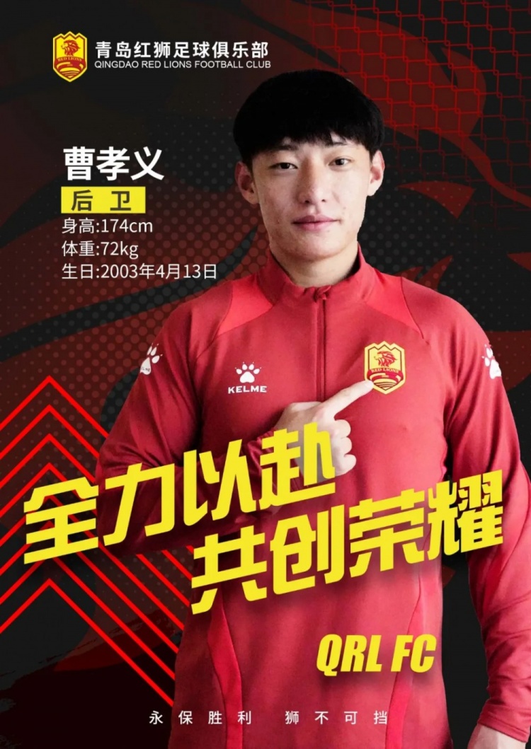 曹孝義,出生于2003年4月13日,身高174cm,體重72kg,場(chǎng)上司職邊后衛。2018年入選湖北足協(xié)U15隊,并以隊長(cháng)身份獲得全國青超聯(lián)賽冠軍;2023賽季簽約無(wú)錫吳鉤隊,中甲聯(lián)賽出場(chǎng)14次,1粒進(jìn)球;足協(xié)杯出場(chǎng)1次,首發(fā)并打滿(mǎn)全場(chǎng)。加入青島紅獅,希望他發(fā)揮所長(cháng),在穩固后防、邊路往返、組織進(jìn)攻和后場(chǎng)出球上給予紅獅更多助力!