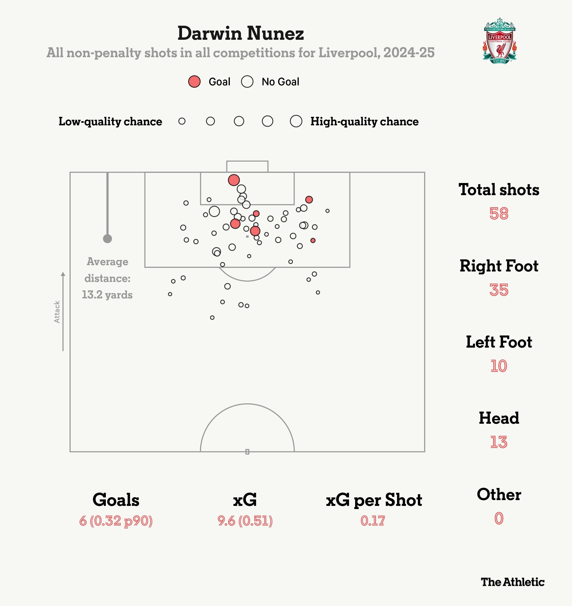 小禁區附近扎堆丟!努涅斯射門(mén)分布:預期進(jìn)球9.6球 實(shí)際只進(jìn)6球
