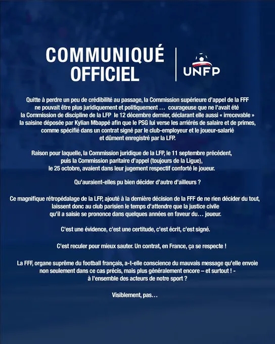 法國職業(yè)球員工會(huì )發(fā)表官方公告,嚴厲批評法國足協(xié)上訴委員會(huì )延續法國職業(yè)聯(lián)盟紀律委員會(huì )去年的決定,前者對姆巴佩和巴黎的薪資糾紛案“不予受理”。