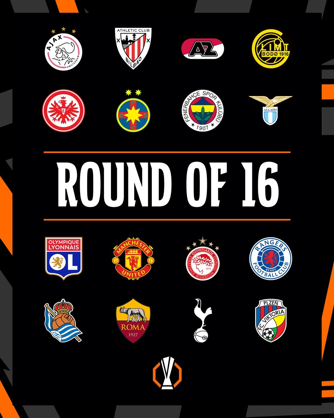 歐聯(lián)16強:拉齊奧、畢巴、曼聯(lián)、熱刺、法蘭克福、里昂、奧林匹亞科斯、流浪者、阿爾克馬爾、羅馬、布加勒斯特星、博德閃耀、比爾森勝利、皇家社會(huì )、費內巴切、阿賈克斯