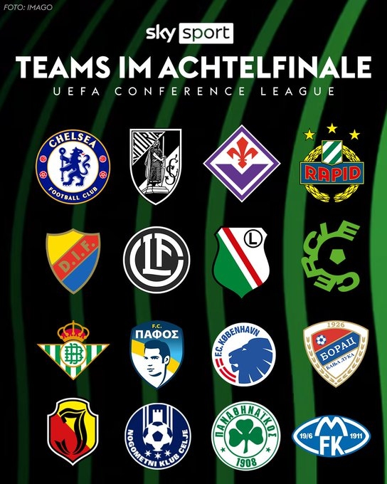 歐協(xié)聯(lián)16強:切爾西、吉馬良斯、佛羅倫薩、維也納快速、尤爾加登、盧加諾、華沙萊吉亞、色格拉布魯日、貝蒂斯、哥本哈根、帕福斯、巴尼亞盧卡戰士、帕納辛奈科斯、采列、喬治羅尼亞、莫爾德