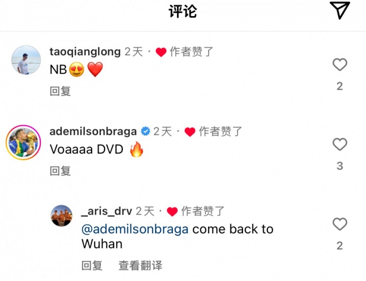 曾經(jīng)在武漢三鎮并肩作戰的陶強龍、埃德米爾森,都留言為戴維森送上了祝福。