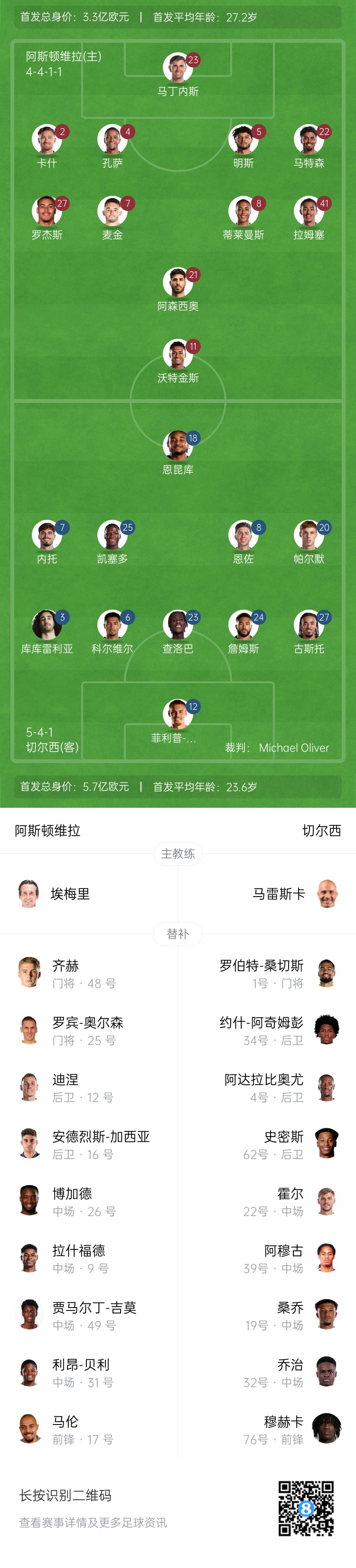 維拉首發(fā):23-馬丁內斯、2-卡什、4-孔薩、5-明斯、22-馬特森、7-麥金、8-蒂萊曼斯、21-阿森西奧、41-雅各布-拉姆塞、27-摩根-羅杰斯、11-沃特金斯