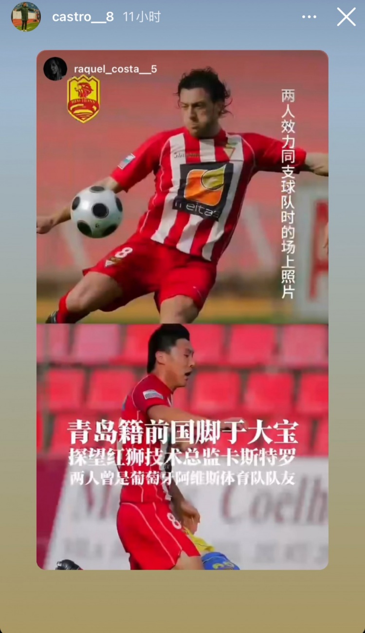 卡斯特羅在社媒曬出他倆的合影并配文介紹寫(xiě)道:“在葡萄牙時(shí)我們是隊友,17年后我們以教練身份在中國相聚?!?/p>