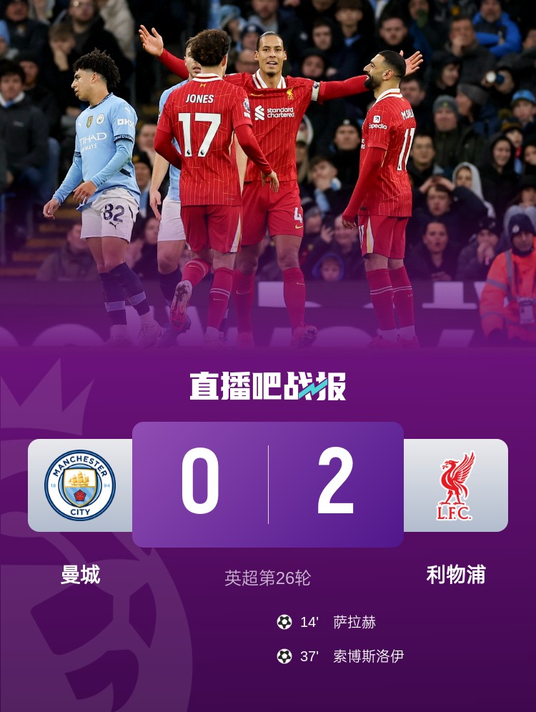 英超第26輪,利物浦2-0雙殺曼城。上半場(chǎng),劉易斯失誤送角球致丟球,薩拉赫和索博斯洛伊互獻傳射,馬爾穆什進(jìn)球越位;下半場(chǎng),瓊斯進(jìn)球越位在先。