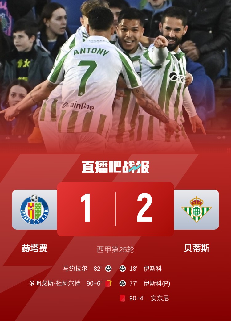 西甲第25輪,貝蒂斯2-1擊敗赫塔費。上半場(chǎng),安東尼長(cháng)途奔襲連續過(guò)人助攻伊斯科破門(mén);下半場(chǎng),安東尼錯失良機,庫喬造點(diǎn),伊斯科點(diǎn)射完成雙響,馬約拉爾扳回一球,補時(shí)安東尼背后鏟人被直紅罰下,多明戈斯-杜阿爾特2黃變1紅也被罰下。