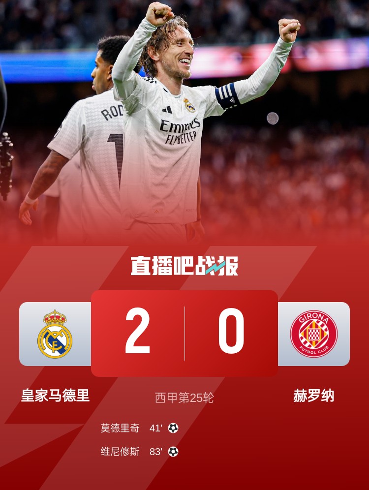 西甲第25輪,皇馬2-0赫羅納。上半場(chǎng),庫爾圖瓦救險撲出范德貝克近距離射門(mén),莫德里奇世界波破門(mén);下半場(chǎng),姆巴佩助攻維尼修斯破門(mén)