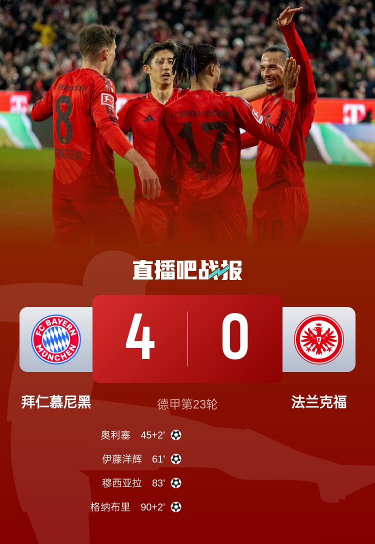 德甲第23輪,拜仁4-0法蘭克福。上半場(chǎng),基米希傷退,奧利塞破門(mén);下半場(chǎng),伊藤洋輝打進(jìn)自己的拜仁生涯首球,穆西亞拉一條龍,格納布里錦上添花。
